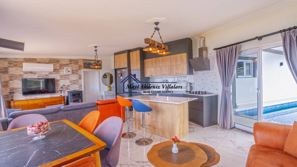 Salon : Salonumuzda oturma grubu, klima, LCD TV, sehpa, uydu alıcı bulunmaktadır. Havuz terasına çıkış yapılabilmektedir.